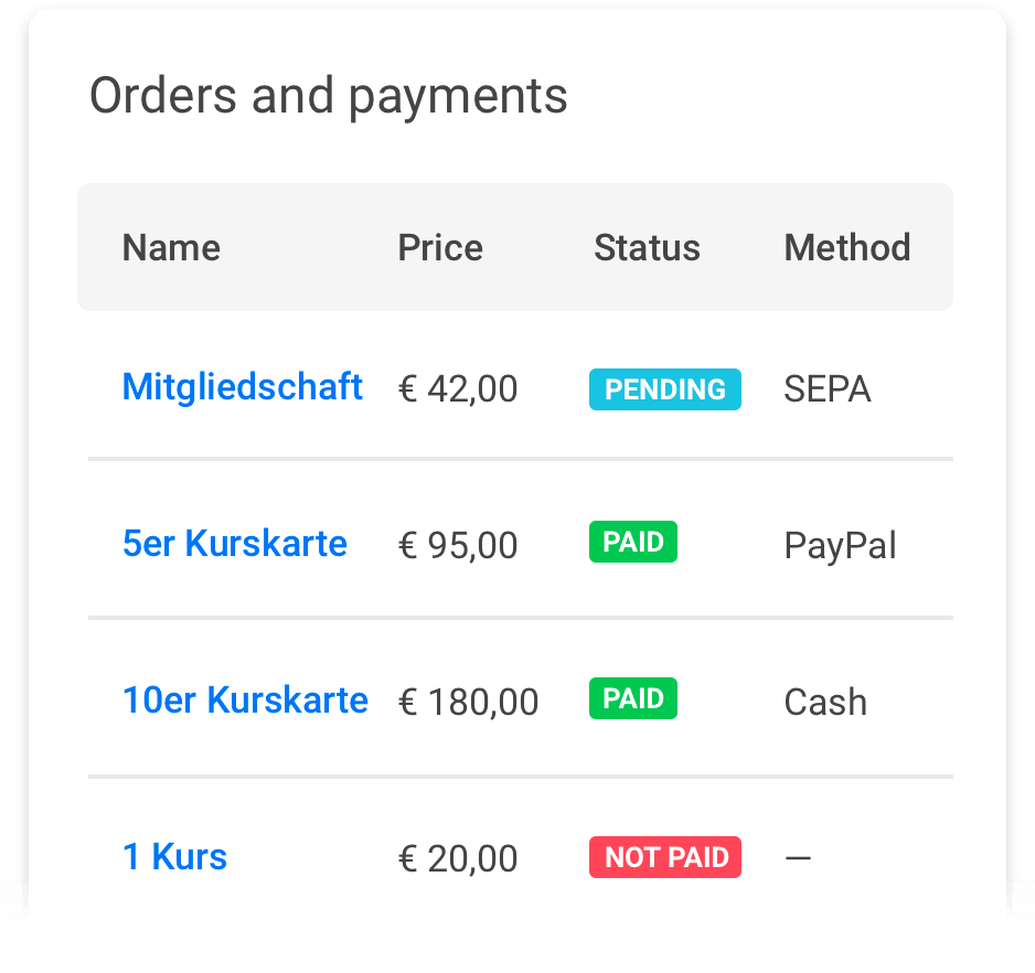 Verfolge Online-Transaktionen, behalte den Überblick über die Anzahl der verkauften Mitgliedschaften und Kurskarten sowie über deine Gesamteinnahmen. Sowohl du als auch deine Yogis haben einfachen Zugang zu Rechnungen im PDF-Format.