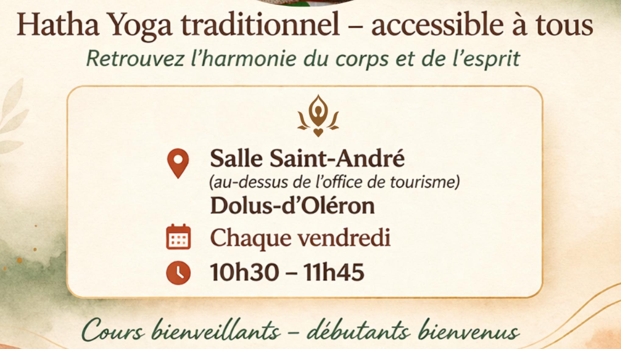 🧘♀️🌿 Hatha Yoga traditionnel doux sur tapis 🗓️ Tous les vendredis ⏰ à 10h30 Une pratique douce pour se recentrer, respirer et relâcher les tensions ✨