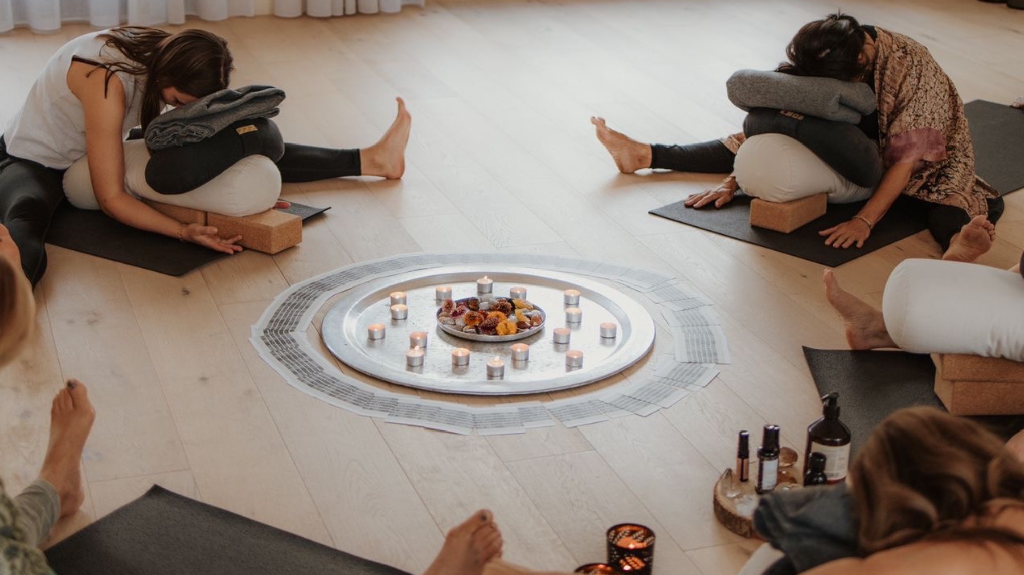 De sessie eindigt met een lange Savasana van een uur, waarin je wordt gewiegd met doeken, subtiele aanrakingen en holistische pulsen.