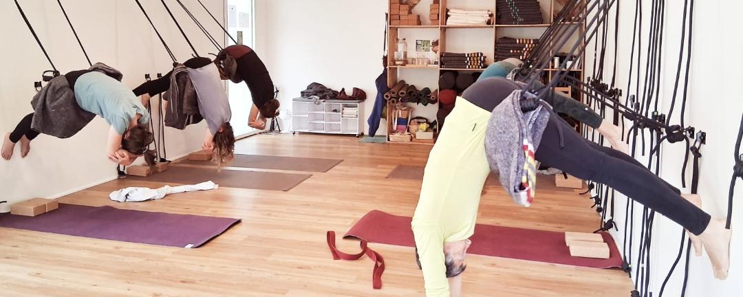 🐚 Le matériel disponible est varié : cordes murales, chaises, bolsters, sangles, briques, poids pour soutenir chaque posture et chaque corps.