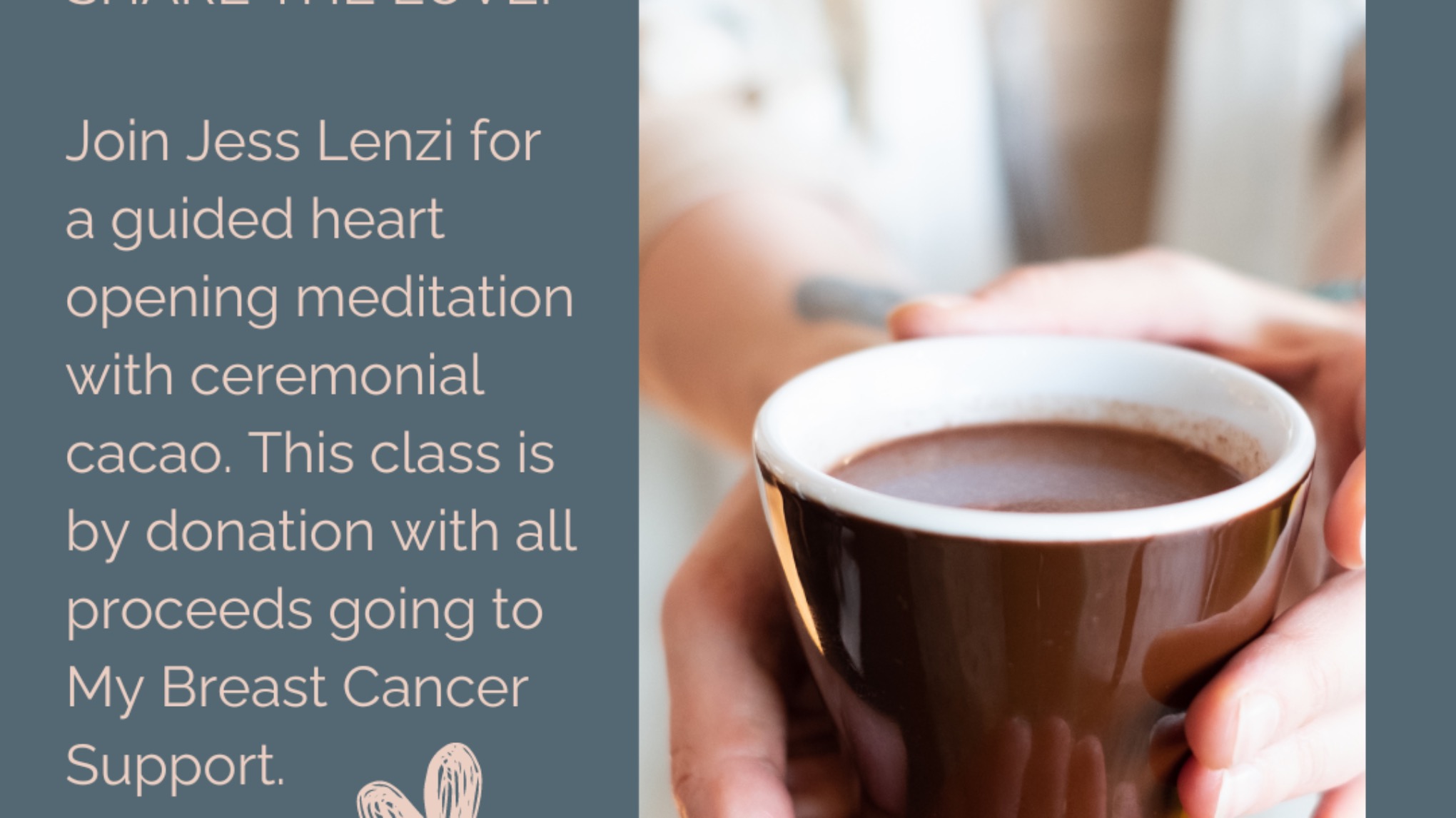 Join Jess Lenzi for a guided heart-opening meditation coupled with the medicine of ceremonial cacao. Together, we will be raising funds for mybreastcancersupport.org, radiating loving kindness to all beings of the world, and filling up our own reserves of self-compassion and love.