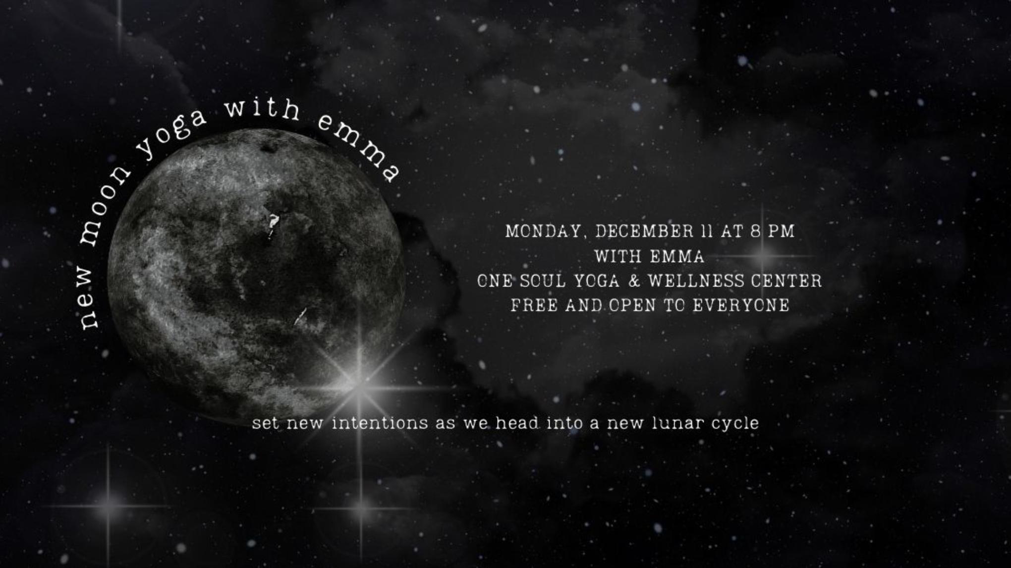 Join Emma as she leads you on a New Moon Flow and intention setting. This free monthly class will help you enter in a new cycle with renewed intentions. While the full moon is a time of release, the new moon is a time to embrace change. Everyone is welcome to attend this free class.