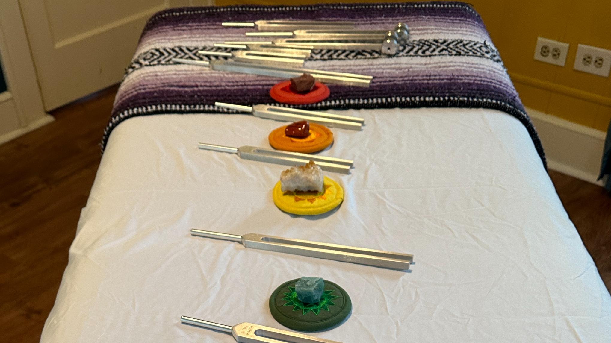 During a chakra tuning fork session, we start with a basic chakra assessment and participant rests on a massage table (fully clothed). Specially calibrated non-weighted forks and other sound instruments (such as singing bowls) are then used around and near the body to help remove blockages, release stagnant energy, and restore balance to the body’s energetic system.