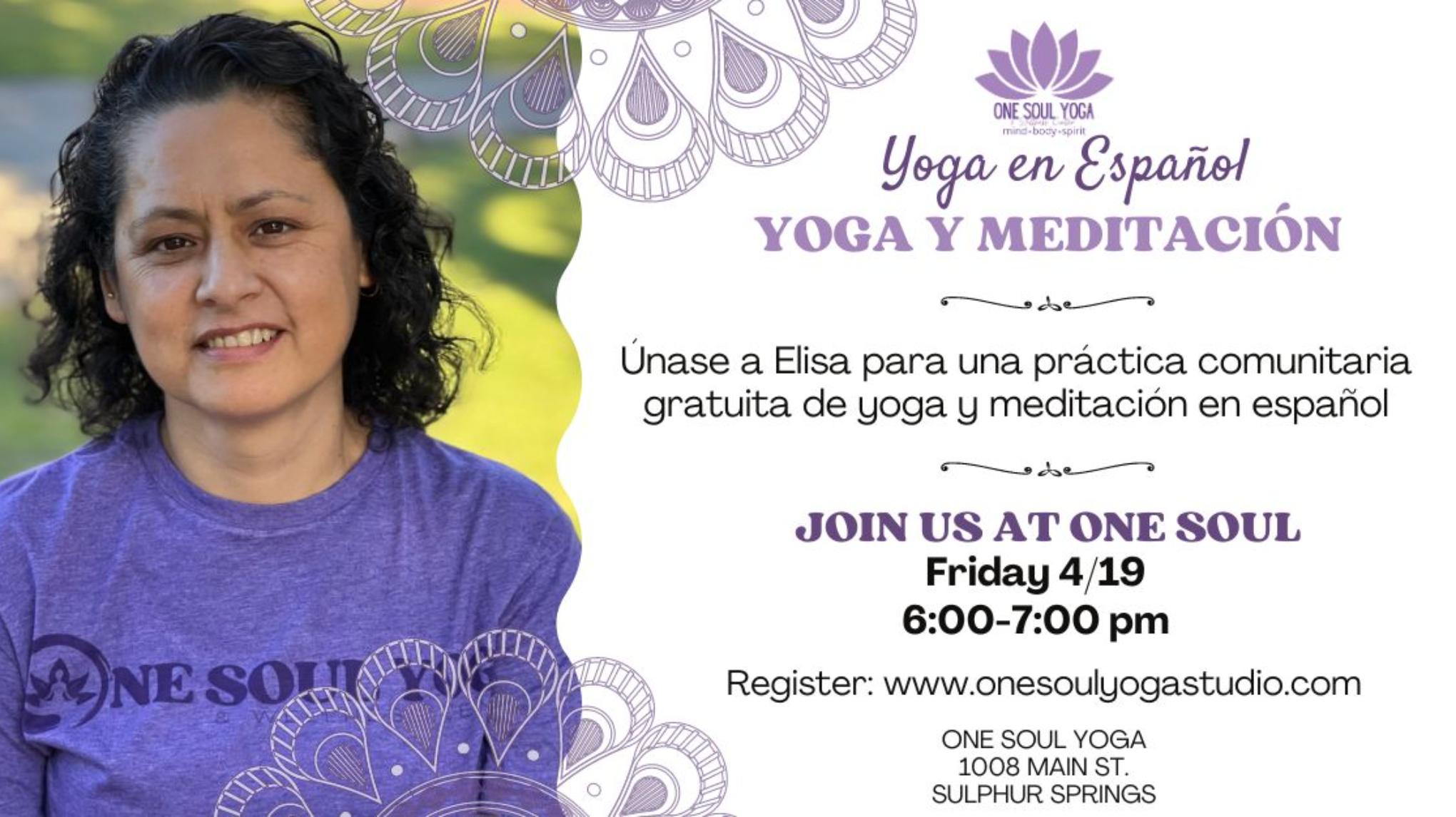 Join Elisa for a free community yoga and meditation practice in Spanish. This one-hour class is perfect for all levels. This class helps you flow and balance during a busy week using a variety of seated, standing, and supine yoga poses. The class ends with guided meditation and relaxing savasana. This class is free and open to everyone. You don't need to speak Spanish to enjoy this class.