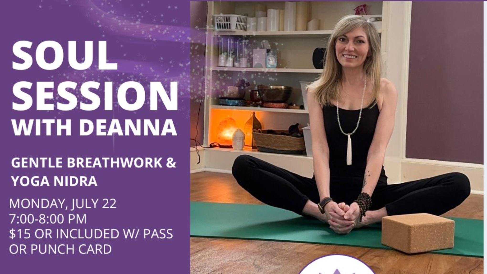 The July Soul Session with DeAnna will combine two powerful stress-relieving techniques into one class. Gentle Breathwork & Yoga Nidra will allow your body and mind integration and relaxation and healing. This special one-hour class will start out with a series of gentle breathwork to guide you into the present moment to feel centered while activating your body’s relaxation response. We will then sink into a guided Yoga Nidra session, a form of yogic sleep meditation to further promote stress reduction and rest. No experience necessary—all levels welcome to join.