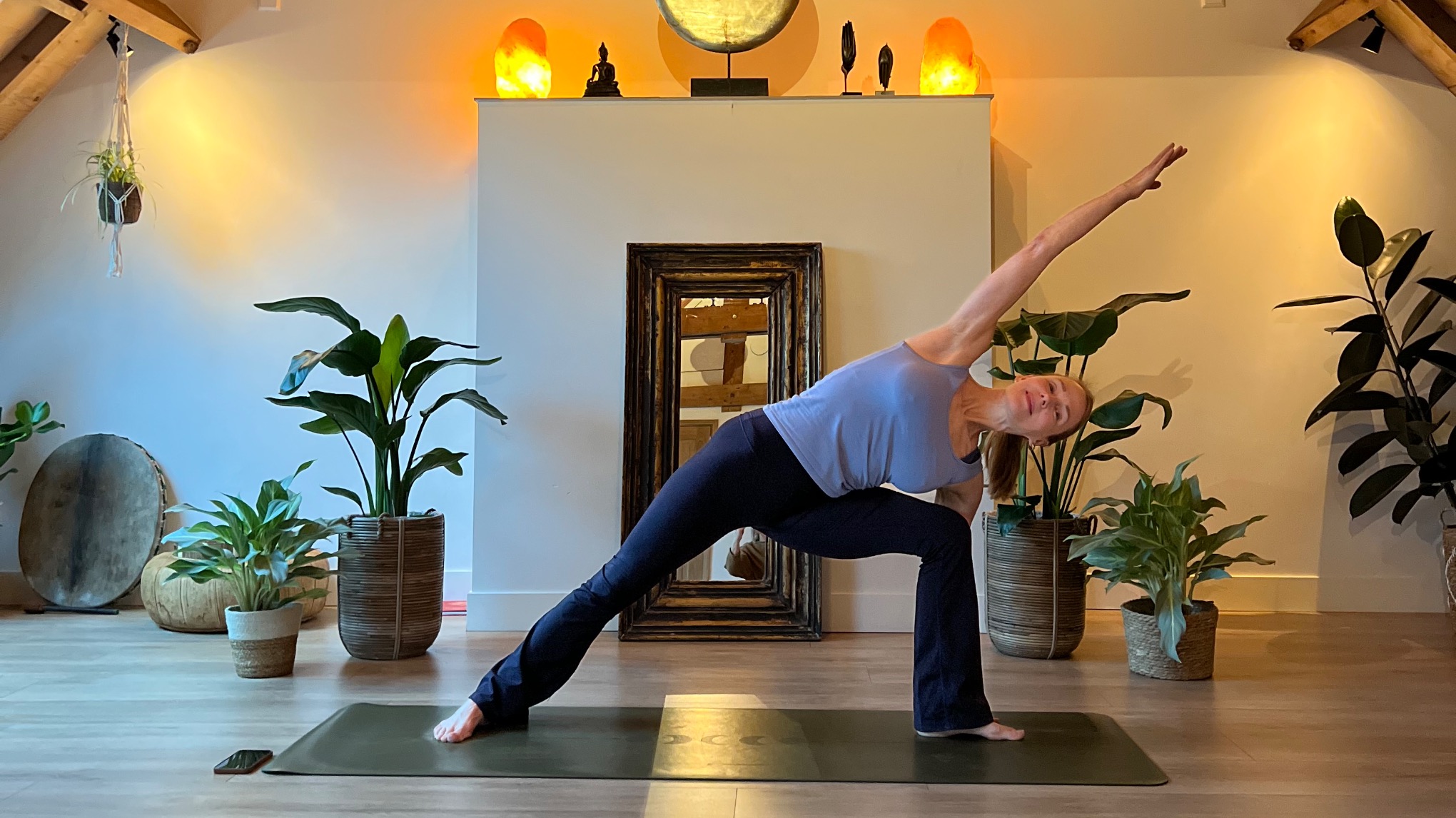 - Warming-up en ademhaling: We beginnen met ademhalingsoefeningen (pranayama) en een zachte opwarming om het lichaam voor te bereiden.