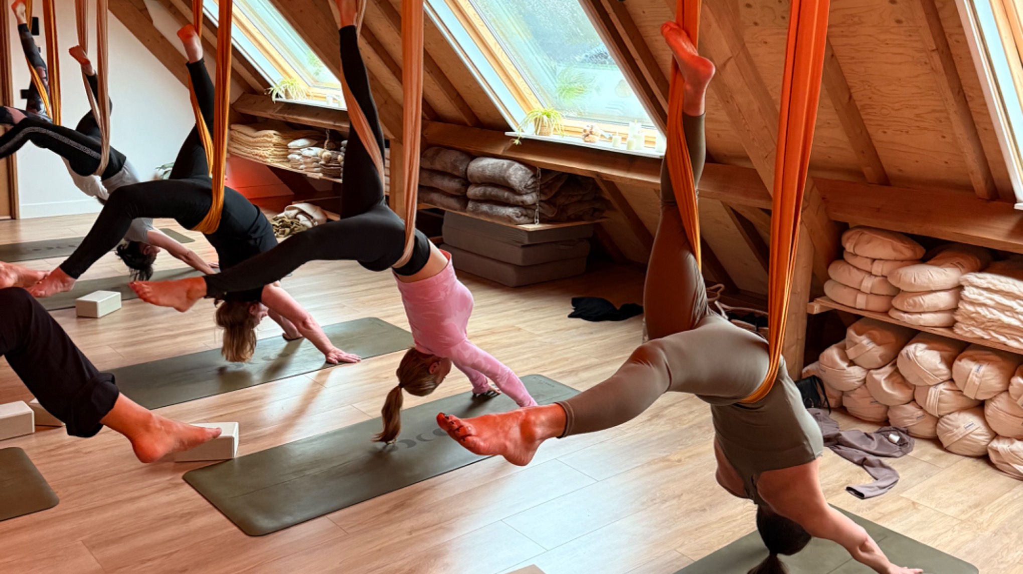 Aerial Vinyasa Yoga is een dynamische en speelse yogavorm waarbij we het doek gebruiken als ondersteuning, uitdaging én uitnodiging om te ontdekken. Adem en beweging vloeien in elkaar over, net als bij vinyasa yoga, maar dan met extra dimensie: we spelen, vliegen, zweven en zetten letterlijk onze wereld af en toe op z’n kop.