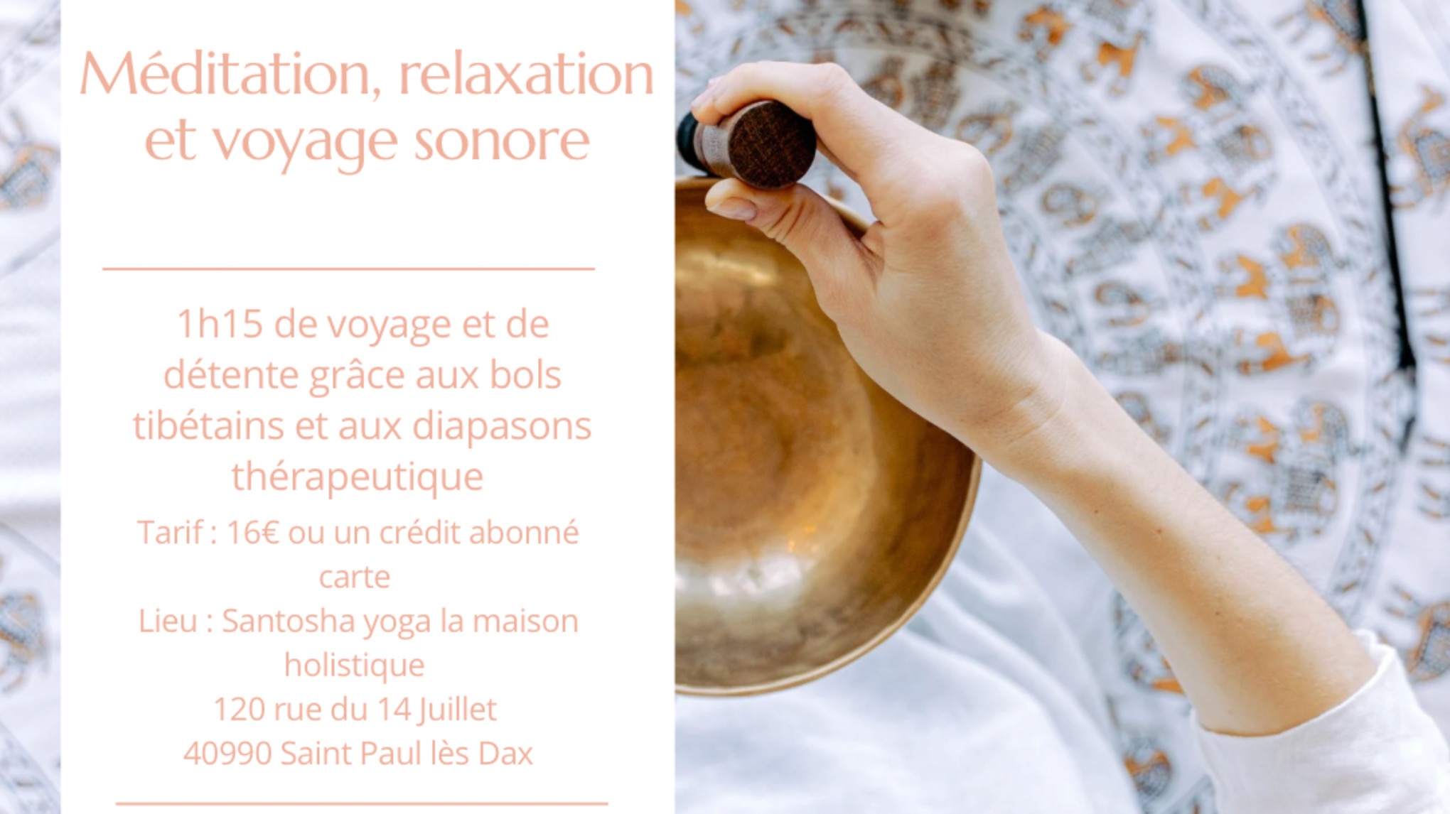 Dimanche 06 Octobre de 10h à 11h15 au 120 rue du 14 Juillet à Saint Paul les Dax chez Santosha yoga, nous nous travaillerons durant 1h15 sur le lâcher prise grâce à la méditation et aux bains vibratoires et sonore.