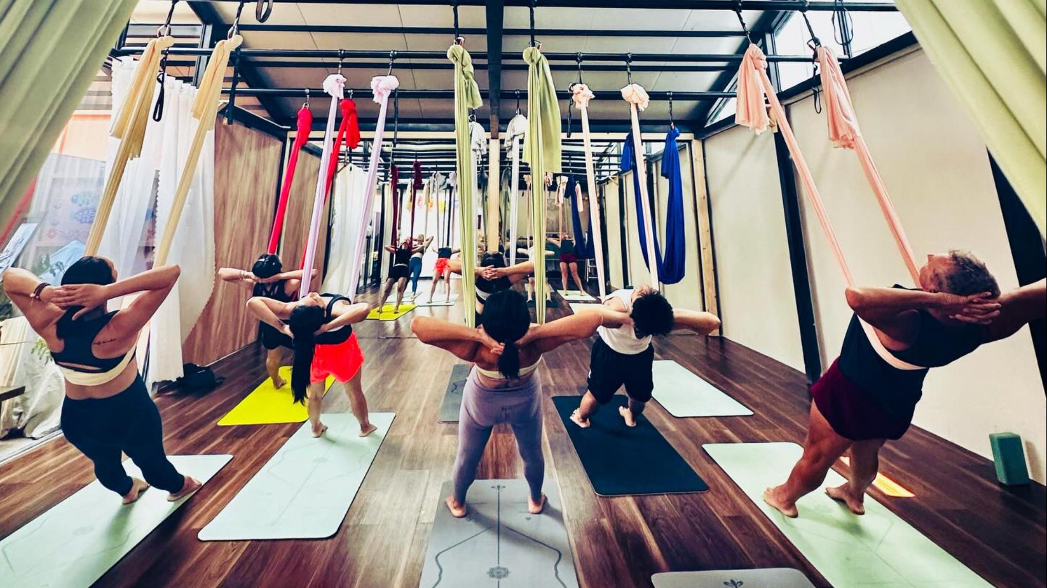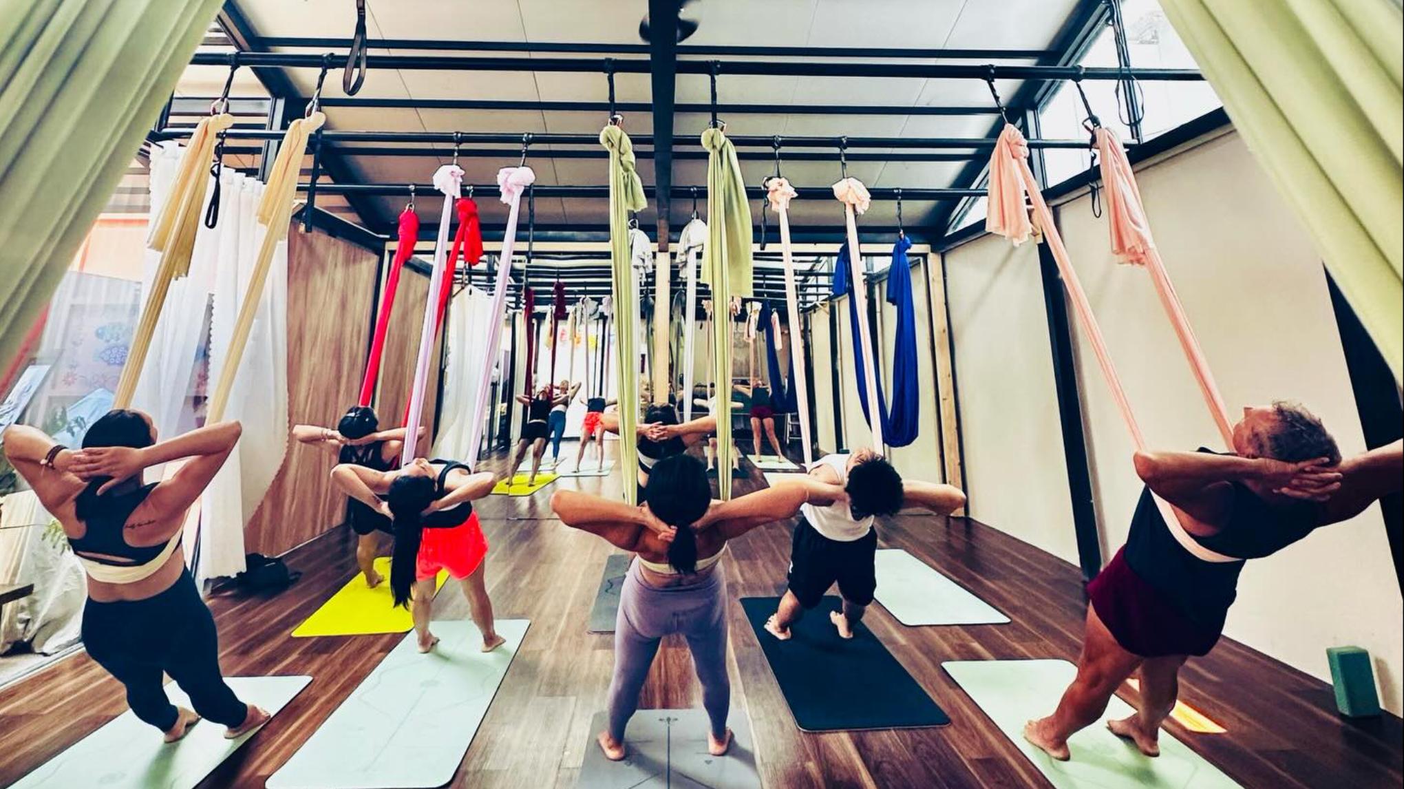 Aerial Yoga is a playful yet grounding practice that uses a soft fabric hammock as a prop to support and enhance traditional yoga postures. The hammock helps create space in the body, allowing for deeper awareness, improved posture, and gentle spinal decompression.