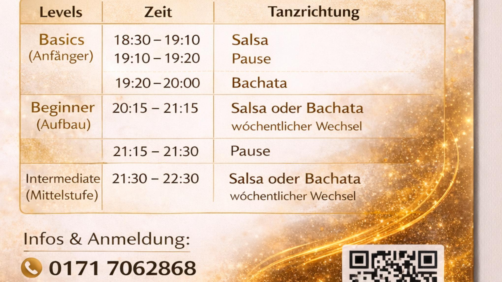 Bist du bereit für das nächste Level? In unserem Beginner Salsa ODER Bachata - Kurs bauen wir auf deinen Tanz-Erfahrungen auf und erweitern dein Repertoire. Wir wechseln wöchentlich zwischen der feurigen Energie der Salsa und den weichen Bewegungen der Bachata, damit du in beiden Tänzen sicherer und vielseitiger wirst.